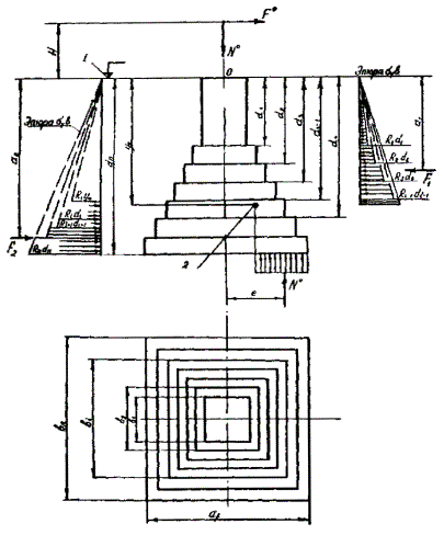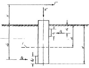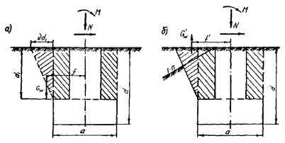 7.10. При нагрузке, равнодействующая которой расположена в одной вертикальной плоскости симметрии фундамента, устойчивое закрепление его в грунте считают обеспеченным, если величины расчетного момента Мd и расчетной вертикальной силы Nd удовлетворяют условиям Мd £ Mf; (61) Nd £ Nf, (62) где Mf - расчетная несущая способность фундамента по грунту на действие момента или горизонтальной силы, приложенной на высоте Н; Nf - расчетная несущая способность фундамента по грунту на действие вертикальной силы. 7.11. В общем случае при нагрузке, одновременно действующей в нескольких плоскостях, проходящих через вертикальную ось фундамента, устойчивое закрепление фундамента в грунте считается обеспеченным, если величины расчетного момента Мdz и расчетной вертикальной силы Nd внешних нагрузок удовлетворяют условиям Мdz £ Nd £ Nf, (64) где 7.12. Расчет железобетонных и бетонных элементов конструкций фундаментов по прочности, деформациям, образованию и раскрытию трещин следует производить в соответствии с требованиями главы СНиП по проектированию бетонных и железобетонных конструкций. 7.13. Ширина раскрытия трещин при расчете конструкций железобетонных фундаментов со стержневой арматурой не должна превышать 0,2 мм. 7.14. Прочность конструкции сборных железобетонных элементов фундаментов должна быть проверена на действие нагрузок, возникающих при транспортировании и монтаже. РАСЧЕТ ОДИНОЧНЫХ ПРИЗМАТИЧЕСКИХ ФУНДАМЕНТОВ Определение расчетной несущей способности фундамента при нагрузке, действующей в одной вертикальной плоскости 7.15. Значение Мf расчетной несущей способности заданного фундамента по грунту на действие момента при нагрузке, равнодействующая которой расположена в одной вертикальной плоскости симметрии фундамента, вычисляют по формуле: Мf = М°'/gcfgcogcvgccgcrgcl, (65) где М°' - значение расчетной несущей способности условного фундамента по грунту на действие горизонтальной нагрузки или изгибающего момента, приведенное к уровню условного обреза фундамента (п. 7.16); gcf - коэффициент условий работы, учитывающий влияние формы поперечного сечения призматического фундамента (п. 7.17); gco - коэффициент условий работы, учитывающий влияние очертания поверхности грунта в месте расположения фундамента (п. 7.18); gcv - коэффициент условий работы, учитывающий влияние вибрации (колебаний) грунта около фундамента от проходящих поездов (п. 7.19); gcc - коэффициент условий работы, учитывающий влияние повышенного уплотнения грунта, имеющего место при забивке фундамента (п. 7.20); gcr - коэффициент условий работы, учитывающий влияние верхнего строения пути (п. 7.21); gcl - коэффициент, условий работы, учитывающий долю постоянной нагрузки в суммарной (п. 7.22). 7.16. Значение М°' расчетной несущей способности условного фундамента относительно уровня условного обреза фундамента определяют из условия: