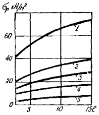 Рис. 10. Коэффициент, учитывающий длину узла подвешивания несущего троса на ригеле жесткой поперечины 2.58. При расчете жесткой поперечины на продольную нагрузку от обрыва несущего троса вертикальная составляющая нагрузки Qп принимается равной весу подвески с учетом гололедного отложения на проводах. 2.59. Реакция необорванных несущих тросов контактных подвесок соседних путей включает статическую и динамическую составляющие. Статическую составляющую реакции тросов следует определять по пп. 5.53 - 5.57 Норм. Суммарная величина реакции тросов равна значению статической составляющей, умноженному на коэффициент динамичности, равный 1,5. 2.60. При проектировании типовых конструкций контактной сети нагрузки от обрыва проводов следует принимать для наиболее тяжелых расчетных условий; максимальной длины пролета, наиболее тяжелого типа контактной подвески и наибольшего веса отложения на проводах. Рекомендуемые при типовом проектировании величины нагрузок приведены в табл. 8 и 9. Примечания. 1. В таблицах приведена максимальная возможная в заданном ветровом районе унифицированная длина пролета, при которой определено усилие от обрыва 2. Максимальная длина пролета определена при значении параметра шероховатости подстилающей поверхности, равном 0,5м. 3. Натяжение несущих тросов равно 20 кН. 2.61. Расчет консольных опор контактной сети на особые сочетания нагрузок, появляющихся в результате обрыва проводов, следует производить только по первому предельному состоянию (по несущей способности). 2.62. Расчетное сопротивление стали для расчета конструкции контактной сети по несущей способности на нагрузки от обрыва проводов следует принимать: при учете гололеда - равным нормативному, а без гололедных отложений - 95 % от нормативного. При расчете железобетонных опор расчетное сопротивление стали может быть повышено на 10 %, а бетона - на 25 %. 2.63. При проектировании консолей необходимо производить проверочный расчет на нагрузки от обрыва проводов. Вертикальную силу, приложенную на конце консоли, следует определять в соответствии с п. 2.52 настоящих Норм. 2.64. Кронштейны фиксаторов для случая обрыва проводов следует рассчитывать на вертикальную нагрузку, приложенную в точке крепления фиксатора и равную массе контактных проводов на длине максимального пролета.