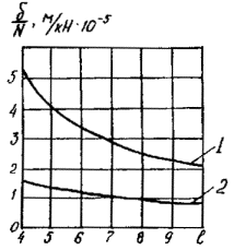 1.3. При проектировании конструкций контактной сети следует: выполнять требования «Технических правил по экономному расходованию основных строительных материалов ТП-101-81*, М., 1985 г.; применять экономичные профили проката и эффективные марки сталей (в т.ч. коррозионностойкие и высокопрочные); применять прогрессивные конструкции (комбинированные из двух марок стали, предварительно напряженные, из высокопрочных пластмасс); предусматривать технологичность изготовления и монтажа конструкций, а также их ремонтопригодность в эксплуатации; обеспечивать заданный срок работы конструкций в эксплуатации; выполнять требования государственных стандартов; обеспечивать наименьшие приведенные затраты на строительство и эксплуатацию. 1.4. При проектировании контактной сети следует применять унифицированные значения ее параметров (габарита опор, длины пролета, длины анкерных участков, длины струн). Для массовых конструкций фундаментов, опор, поддерживающих, фиксирующих и анкеровочных устройств контактной сети следует разрабатывать типовые проекты и до массового применения в конкретных проектах проверять конструкции испытанием опытных образцов. В проекте должны быть схемы испытаний и значения контрольных нагрузок для них. 1.5. Расчет конструкций контактной сети следует производить по методу предельных состояний. Повторяемость климатических нагрузок при расчете контактной сети следует принимать один раз в 10 лет. 1.6. Механический расчет проводов выполняется методами статического расчета согласно указаниям главы 3 данных норм. Длина пролета между опорами определяется методом динамического расчета в соответствии с методикой, изложенной в обязательном приложении 1. 1.7. Расчет опорных, поддерживающих и фиксирующих устройств контактной сети следует выполнять с учетом коэффициента надежности по назначению gп = 0,95. На коэффициент gп следует делить: предельные значения несущей способности, расчетные значения сопротивлений, предельные значения деформаций, раскрытия трещин или умножать: расчетные значения нагрузок, усилий или воздействий. 1.8. При расчете опор контактной сети по деформациям (предельному состоянию второй группы) следует определить изменение прогиба опоры от воздействия временных нормативных нагрузок, добавляя к ним нагрузки от изменения натяжения проводов. Изменение упругого прогиба консольных опор на уровне контактного провода (без учета поворота фундамента) не должно превышать ± 65 мм, а упругого прогиба вершины опор гибких поперечин должно быть не более 1/150 их высоты. 1.9. Расчет железобетонных опор по образованию или раскрытию трещин (вторая группа предельных состояний) следует осуществлять на сочетание постоянных нормативных нагрузок и временных климатических нагрузок годичной повторяемости: при этих нагрузках поперечные трещины в предварительно напряженных опорах с проволочной арматурой не допускаются. 1.10. Привязку типовых конструкций контактной сети в проектах электрифицируемых участков необходимо выполнять по расчетным нагрузкам; значения допустимых расчетных нагрузок должны быть приведены в типовых проектах конструкций контактной сети. Железобетонные опоры при привязке, кроме того, следует проверять по нагрузкам, допустимым по образованию или раскрытию трещин, определяемым согласно указаниям п