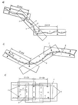 невязку следует подсчитывать по формуле 3.23. Для производства технического нивелирования следует использовать нивелиры с увеличением труб не менее 20* и ценой деления цилиндрического уровня не более 45² на 2 мм или нивелира с компенсатором. Для определения высот точек базисных ходов, прокладываемых на железнодорожных станциях, надлежит применять нивелиры с увеличением трубы 25* и ценой деления цилиндрического уровня не более 25² на 2 мм. При проложении нивелирных ходов должны соблюдаться требования СНиП 1.02.07-87. 3.24. Для определения длин линий при тригонометрическом нивелировании следует использовать светодальномеры, электронные и электрооптические тахеометры, которые обеспечивают среднюю квадратическую погрешность измерения расстояния не более ±2 см. Для измерения вертикальных углов нужно использовать теодолиты типа 2Т2 и 2Т5 или равноточные им электронные и электрооптические тахеометры. Рекомендуется использовать теодолиты с компенсаторами места нуля вертикального круга. 3.25. Измерения вертикальных углов теодолитами типа 2Т2 (или равноценными им по точности электрооптическими и электронными тахеометрами) следует выполнять одним приемом с наведением на визирную цель центральной нити сетки нитей. При использовании теодолитов типа 2Т5 (или равноценных им электролитических и электронных тахеометров) вертикальные углы следует измерять двумя приемами или одним приемом методом трех нитей. 3.26. При тригонометрическом нивелировании точек ходов съемочной геодезической сети вертикальные углы следует измерять в прямом и обратном направлениях. Разрыв во времени между измерениями «прямо» и «обратно» не должен превышать 1 ч. Контролем измерений вертикального угла в поле служат вычисленные значения места нуля (места зенита), которые не должны отличаться от средних значений за день более чем на 6². 3.27. При планово-высотной привязке опознаков с точек магистральных ходов методом полярных координат и при тригонометрическом нивелировании для получения продольного профиля железной дороги допускается измерять вертикальные углы в одну сторону при одном круге с обязательным определением места нуля вертикального круга в начале, середине и конце рабочего дня. Расстояние до определяемой точки не должно превышать 300 м. 3.28. Вычисление превышений рекомендуется выполнять в поле: при производстве тригонометрического нивелирования электронными и электрооптическими тахеометрами - с помощью микропроцессора, встроенного в прибор, при использовании светодальномеров, установленных как насадка на колонки теодолита - с помощью микрокалькулятора. Планово-высотное обоснование аэрофотосъемки3.29. Проект планово-высотного обоснования маршрутной аэрофотосъемки следует составлять с учетом назначения топографических планов, их масштаба и типа стереофотограмметрических приборов, используемых при обработке аэрофотоснимков. Рекомендуемые схемы расположения планово-высотных опознаков для обоснования маршрутов аэрофотосъемки приведены на рис. 1.