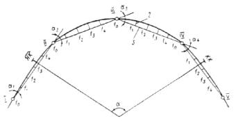 Рис. 2. Схема съемки кривых методом И.В. Гоникберга: I-V - стоянки теодолита; 1 - наружный рельс; 2 - стрелы; 3 - хорды 3.149. На линиях с интенсивным движением поездов для повышения безопасности топографических работ железнодорожные кривые следует снимать с теодолитного (марочного) хода, проложенного вдоль земляного полотна. Стоянки теодолита закрепляют, как правило, со стороны наружного рельса по нормали к кривой на расстоянии от него не менее 2 м так, чтобы линия визирования не пересекала наружный рельс. Разбивка кривой на «двадцатки» производится так же, как и в случае съемки по головке рельса. Если пикетаж и разбивка кривой на «двадцатки» производится по марочному ходу, необходимо учитывать домер, который следует вычислять по углу поворота сторон хода и радиусу, указанному в эксплуатационном продольном профиле. 3.150. Съемка кривых существующего железнодорожного пути с помощью электрооптических и электронных тахеометров или светодальномеров сводится к последовательному определению координат равномерно расположенных точек по оси пути или по одному из рельсов. Для фиксирования оси пути следует применять специальную штангу с отражателем. Если же определяются координаты головки рельса, используют раздвижную веху с укрепленным на ней отражателем. Кривую на равные отрезки (длиной 10-20 м) можно не разбивать, а использовать стыки рельсов или определять расстояния «на глаз». Координаты точек кривой определяют методом полярных координат с точек светодальномерного хода или произвольного базиса. Съемку небольших отдельных кривых можно выполнять с одной точки, не прокладывая светодальномерного хода. Положение точек магистрального хода или произвольного базиса выбирают в стороне от кривой так, чтобы расстояние до точек на оси пути не превышало 300 м.