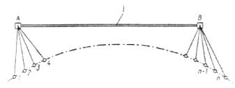 Рис. 3. Схема съемки кривой с базиса: 1, 2¼n - точки на оси пути; ¾ × ¾ × ¾ × ¾ × - ось пути 3.151. Если съемку кривой производят с одной точки, то при вычислениях ей приписывают условные координаты, а за начальное принимают произвольное направление, считая его дирекционный угол равным 0°. При съемке кривой с произвольного базиса (рис. 3) измеряют длину базиса и с обоих концов базиса выполняют съемку точек кривых. Точке А приписывают произвольные значения координат, а дирекционный угол базиса принимают равным 0°. Зная длину базиса АВ, измеренную светодальномером, вычисляют координаты точки В и дальнейшие вычисления координат точек кривой выполняются известным способом. Если пикетаж железнодорожного пути определяют координированием точек его оси с точек светодальномерного хода, то отдельные точки или базисы, необходимые для съемки кривой, включают в общий светодальномерный ход и расчет координат точек кривой выполняют в системе этого хода. 3.152. Для определения угла поворота кривой во всех случаях первые (1, 2) и две последние (п-1; п) точки должны лежать на прямых, примыкающих к кривой. Угол поворота кривой получают как разность дирекционных углов линий 1-2 и (п-1)-п. 3.153. Пикетажные значения точек кривой следует определять последовательным суммированием расстояний между смежными точками, вычисленных по их координатам на ЭВМ или программируемом микрокалькуляторе. Искусственные сооружения и водоотводы3.154. При специальной съемке искусственных сооружений должны быть установлены: пикетажное значение пересечения оси сооружения с осью пути, по которому разбит пикетаж; отверстие и материал сооружения; отметки основных элементов сооружения; техническое состояние сооружения. 3.155. При съемке моста должны быть определены отметки: головки рельса по краям и в середине пролета; верха кордонных камней; подферменной площадки на береговых устоях и на каждой промежуточной опоре; меженного и наивысшего наблюденного горизонта воды по данным службы пути. При съемке водопропускных труб должны быть определены отметки: головки рельса по оси трубы; верха оголовков и низа лотка с обеих сторон. При съемке пешеходных мостов и путепроводов необходимо определить: угол, под которым они пересекают оси железнодорожного пути; расстояние от наружных граней опор до осей путей, между которыми они находятся; для пешеходных мостов - высоту от головки рельса до низа конструкции и верха мостового настила; для путепроводов - высоту от головки рельса нижнего пути или одежды дороги до низа ферм и подошвы рельсов верхнего пути или до верха настила путепровода. 3.156. По нагорным и водоотводным канавам или лоткам, удаленным от пути и не зафиксированным на поперечных профилях, снимают (по дополнительному заданию): продольные профили на всем протяжении канав до места выпуска вод из них в лога или овраги; поперечные сечения канав через каждые 100 м и в характерных местах с указанием рода укрепления русла и откосов канав; искусственные сооружения на канавах (трубы, перепады, быстротоки и т.п.). Пересечения линий электропередач и связи3.157. В пределах заданных границ должны быть сняты все пересечения трассы новой дороги и существующих железнодорожных путей линиями электропередач (ЛЭП) и связи (ЛС), при этом должны быть определены: пикетажное значение и угол пересечения ЛЭП (ЛС) с трассой 