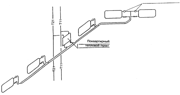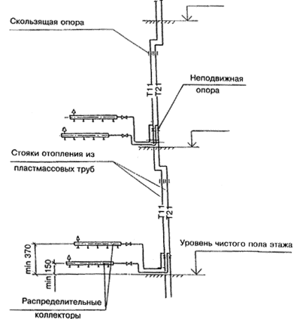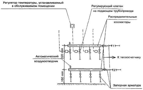 Изменение температуры на поверхности пола Рисунок 2 - Схемы укладки труб в системах напольного отопления и графики изменения температуры на поверхности пола 3.9 Среднюю температуру поверхности пола следует принимать с учетом требований нормативных документов, а также ограничений для различных видов покрытия (например, максимально допустимая температура для паркета 27 °С). 3.10 Виды покрытий из искусственных материалов должны иметь показатели, в том числе санитарно-гигиенические, разрешающие применение их в конструкции теплого пола. 3.11 Кроме средней величины температуры пола, на комфортность помещений влияет неравномерность температуры на поверхности пола. Перепад температуры на отдельных участках пола при напольном отоплении не должен превышать 10 °С (оптимально 5 °С). 3.12 Вариант прокладки трубопроводов систем отопления с встроенными в полы нагревательными элементами из металлополимерных труб представлен на рисунке 3. 1 - настил пола; 2 - слой бетона; 3 - труба нагревательного элемента; 4 - скоба якорная; 5 - тепло- и гидроизоляция; 6 - плита перекрытия; 7 - боковая теплоизоляция Рисунок 3 - Прокладка трубопроводов системы отопления со встроенными в полы нагревательными элементами из металлополимерных труб 3.13 Глубина укладки металлополимерной трубы определяется в зависимости от температуры теплоносителя и материала покрытия пола. 3.14 Оптимальный шаг укладки металлополимерных труб (расстояние между осями) определяется конкретно колебаниями температуры на поверхности пола и экономическими соображениями. 3.15 Система центрального отопления, полностью или частично выполненная из металлополимерных труб, может быть с нижней и верхней разводкой, однотрубная или двухтрубная. Применение труб рекомендуется в системах: - с горизонтальными двухтрубными ветками для группы параллельно-последовательно подсоединенных отопительных приборов (рисунки 4, 5); - с горизонтальными однотрубными ветками для группы последовательно подсоединенных приборов (рисунок 6); - с распределительными коллекторами (рисунки 7, 8). В системах с распределительными коллекторами присоединение отопительных приборов может быть осуществлено путем прокладки металлополимерных труб в форме «петель» в полу или вдоль стен под плинтусами. Рекомендуется, чтобы каждая петля обслуживала одну квартиру или группу помещений одного потребителя. К одному коллектору может присоединяться до 8 «петель». На рисунке 9 представлен вариант подсоединения отопительных приборов к стоякам отопления. 3.16 Рекомендуемые скорости теплоносителя в металлополимерных трубопроводах допускается принимать на 20 % больше, чем в стальных трубопроводах. 3.17 В системах отопления с использованием металлополимерных труб следует предусматривать автоматические или ручные воздухоотводчики на отопительных приборах и на распределительных коллекторах. Встроенный терморегулятор Рисунок 4 - Система отопления с горизонтальными двухтрубными ветками для группы параллельно-последовательно соединенных отопительных приборов