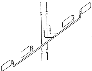 Рисунок 5 - Узлы подсоединения отопительных приборов к двухтрубной системе отопления Рисунок 6 - Система отопления с горизонтальными однотрубными ветками для группы последовательно соединенных отопительных приборов Рисунок 7 - Распределительный коллектор системы отопления Рисунок 8 - Вариант подсоединения распределительных коллекторов к стоякам из металлополимерных труб Рисунок 9 - Подсоединение отопительных приборов к стоякам из стальных труб ГИДРАВЛИЧЕСКИЕ ХАРАКТЕРИСТИКИ МЕТАЛЛОПОЛИМЕРНЫХ ТРУБ 3.18 При гидравлическом расчете падение давления DР в системе отопления складывается из потерь давления на трение по длине трубопровода l и потерь давления на преодоление местных сопротивлений DP = Rl + Z, (1) где R - удельная линейная потеря давления на 1 м длины, Па/м; Z - потеря давления на местное сопротивление, Па/м. 3.19 Гидравлические характеристики металлополимерных труб различных фирм при t = 80 °С представлены в приложении Б. Потери давления по длине, Па/м, можно определить по формуле