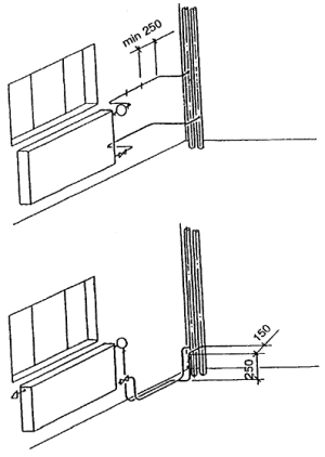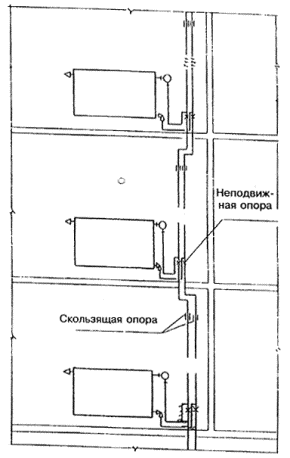 где Lк - вылет компенсатора; dн - наружный диаметр трубы, мм; Dl - изменение длины участка трубопровода при изменении температуры воздуха при монтаже и эксплуатации; 30 - коэффициент эластичности для полимерных труб. На рисунке 12 показан пример традиционного решения компенсации удлинений стояков для систем отопления с применением металлополимерных труб. Перепад температур, °С Рисунок 10 - Диаграмма для определения удлинения труб