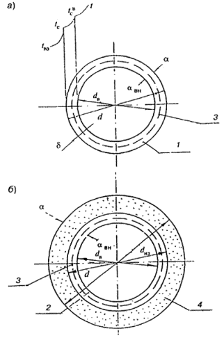 где tс - температура на наружной поверхности трубопровода, °С; Q - тепловой поток, Вт; l - длина трубы, м; t - температура теплоносителя, °С; tвз - температура воздушной среды, °С; aн - коэффициент наружной теплоотдачи, Вт/м2 × К; dн - наружный диаметр трубы, мм; l - коэффициент теплопроводности, Вт/м × К; dв - внутренний диаметр трубы, мм; aвн - коэффициент внутренней теплоотдачи, Вт/м2 × К; a - без теплоизоляции; б - с изоляцией; 1, 2 - полиэтиленовая оболочка; 3 - алюминиевая труба; 4 - теплоизоляция Рисунок 13 - Схема металлополимерной трубы для расчета теплопередачи через цилиндрическую стенку При оценке возможности выпадения конденсата на поверхности трубы необходимо определить температуру наружной стенки трубы и сопоставить ее с температурой точки росы tр.