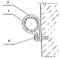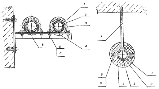 1 - труба; 2 - фиксатор; 3 - хомут; 4 - шуруп (дюбель) Рисунок 17 - Крепление труб к стенам и перегородкам 1 - хомут; 2 - труба; 3 - мягкая прокладка; 4 - теплоизоляция; 5 - болт; 6 - гайка; 7 - подвеска; 8 - кронштейн Рисунок 18 - Крепление трубопроводов Необходимо предусматривать крепление на поворотах и ответвлениях трубопроводов. 5.23 Распределительные коллекторы и запорно-регулирующую арматуру следует закреплять с помощью самостоятельных неподвижных креплений для устранения передачи усилий на трубопровод в процессе эксплуатации. 5.24 Для закрепления труб рекомендуется применять изделия согласно каталогам фирм-изготовителей труб или иные опоры, применяемые для пластмассовых труб. Возможные способы крепления представлены на рисунках 17, 18. ИСПЫТАНИЕ СИСТЕМЫ ОТОПЛЕНИЯ 5.25 После выполнения монтажных работ следует провести испытание системы на герметичность при давлении, превышающем рабочее в 1,5 раза, но не менее 0,6 МПа, при постоянной температуре воды. 5.26 При подготовительных работах перед гидравлическим испытанием системы необходимо: - отключить (временно снять) предохранительные клапаны, регулировочные клапаны, датчики и др., если допустимое давление указанной арматуры меньше величины пробного давления по 5.25; - отключенные элементы заменить заглушками или запорными клапанами, допустимое давление для которых больше величины пробного давления; - подключить к системе манометр с точностью измерения 0,01 МПа. 5.27 Систему следует заполнить водой медленно при открытых воздухоспускных устройствах во избежание образования воздушных пробок. 5.28 Гидравлические испытания необходимо проводить при постоянной температуре в два этапа: 1-й этап - в течение 30 мин дважды поднимать давление до расчетной величины через каждые 10 мин. В последующие 30 мин падение давления в системе не должно превышать 0,06 МПа; 2-й этап - в последующие 2 ч падение давления (от давления, достигнутого на 1-м этапе) не должно быть больше, чем на 0,02 МПа. 5.29 Гидравлическое испытание системы напольного отопления необходимо проводить до заливки трубопроводов бетоном (раствором). 5.30 Тепловое испытание напольных систем отопления из металлополимерных труб следует осуществлять после того, как бетон окончательно затвердеет, т.е. через 20 - 28 дн. Испытания следует начинать с температуры теплоносителя 25 °С с ежедневным увеличением температуры на 5 °С до тех пор, пока она не будет соответствовать проектной величине. РЕМОНТНЫЕ РАБОТЫ 5.31 Слесари-сантехники, производящие ремонт, должны быть ознакомлены со свойствами металлополимерных труб и технологией их обработки. 5.32 При замене труб во время ремонта не допускается ставить трубы меньшего диаметра, чем заменяемые трубы. 5.33 В случае повреждения участка трубопровода целесообразно вырезать поврежденный участок. Замена производится с помощью отрезка трубы нужной длины, соединяемого с трубопроводом специальными соединительными деталями. Поврежденный участок трубы монтируется при помощи 2 соединений с накидной гайкой через ниппель с уплотнением резьбовой части или двухсторонних соединений с обжимной гайкой и обжимным кольцом без уплотнения резьбовой части. 5.34 При проведении сварочных или иных огневых работ в местах возможного термического или механического повреждения труб необходимо ставить ограждения. 5.35 Для очистки наружной поверхности труб