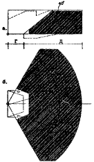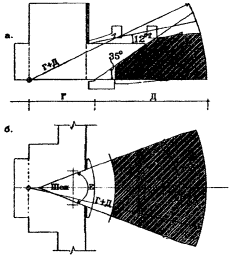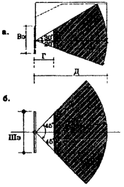 Г – глубина расстояния от экрана до спинки сиденья 1го ряда; Д - длина зрительного зала (предельное расстояние – 45м); Вэ - высота рабочего поля киноэкрана; Шэ - ширина рабочего поля киноэкрана Рис.3 Зоны оптимальной видимости – зоны расположения зрителей. А - перед сценой, Б - перед эстрадой; В - перед киноэкраном; а - разреза, б - план.