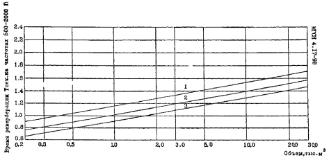 1) Допускается увеличение или уменьшение показателя на 20%. @ 4.30. Форма зрительного зала, его размеры, звукоотражающие поверхности должны обеспечивать равномерное распределение прямой и отраженной звуковой энергии на всех зрительских местах, исключать возможность возникновения эха, концентрации звуковых отражений (особенно поздних). В зрительном зале необходимо обеспечить ранними интенсивными отражениями зрительские места, расположенные на расстоянии более 8 м от источника звука (на сцене или эстраде). Запаздывание наиболее раннего из этих отражений, а также промежутки времени между приходами последующих отражений (время реверберации) не должны превышать 30 миллисекунд (для театральных залов оперных и балетных - 35 мс.). 4.31. Рекомендуемое время реверберации, необходимое для расчетов при выборе отделки зала, помещений хора, оркестра следует определять по графику на рис. 4. На частоте 125 Гц допускается, а в зрительных залах театров оперы и балета целесообразно, увеличение времени реверберации до 20%. 4.32. Мероприятия по звукоизоляции помещений следует предусматривать в соответствии с требованиями МГСН 2.04-97. @ 4.33. В залах, оборудованных киноустановками, при расположении динамиков за киноэкраном, следует предусматривать для стены за экраном звукопоглощающую отделку с коэффициентом звукопоглощения не менее 0,6 в диапазоне частот 100 - 4000 Гц. Звукопоглощающую отделку следует предусматривать также в кинопроекционных и звукоаппаратных.