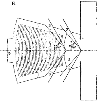 Рис.2. Расчетные параметры зрительных залов с колосниковой глубинной портальной сцены А – разрез, Б - план; 1 - сцена, 2 - арьерсцена, 3 - карманы, 4 - авансцена, 5 - оркестровая яма; а - длина зала, б - превышение луча зрения зрителя над головой впереди сидячего, в - вертикальный угол размещения зрительских мест, г - горизонтальный угол размещения зрительских мест, д - вертикальный угол размещения зрит. мест