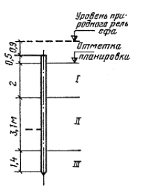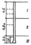 Рис. 8. Схема геологического разреза I-насыпной слой (суглинок тугопластичный) IL=0,5; II-глина тугопластичная IL=0,5; III-песок средней крупности, средней плотности Пример 9. Требуется определить несущую способность по грунту основания полой круглой железобетонной сваи наружным диаметром d=0,78 м, внутренним диаметром d1=0,62 см, длиной l=6 м. Погружение сваи предусматривается вибратором ВП-1 на глубину lп=4,2 м с оставлением грунтового ядра. Грунтовые условия приводятся на рис. 8. Решение. Расчет сваи по несущей способности производится по формуле [7(7)]. Площадь опирания сваи на грунт