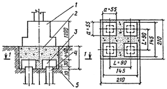 Rp=6,3 кгс/см2-расчетное сопротивление бетона при марке бетона панели М150 (табл. 13 главы СНиП II-21-75). Таким образом, прочность панели в растянутой зоне обеспечивается. ПРИЛОЖЕНИЕ 11РАСЧЕТ ЖЕЛЕЗОБЕТОННЫХ ПЛИТНЫХ РОСТВЕРКОВ СВАЙНЫХ ФУНДАМЕНТОВ ПОД КОЛОННЫ ЗДАНИЙ И СООРУЖЕНИЙ 1. Расчет железобетонных плитных ростверков свайных фундаментов под колонны должен производиться по прочности, а в случае возможности воздействия на ростверк агрессивных грунтовых вод-по раскрытию трещин. 2. Расчет ростверков по прочности необходимо производить: на продавливание ростверка колонной, на продавливание нижней плиты ростверка угловой сваей, на поперечную силу в наклонных сечениях, на изгиб ростверка и на местное смятие под торцами колонн. При расчете ростверка, предназначенного под сборные железобетонные колонны, необходимо также проверять прочность стакана ростверка. 3. Расчет на продавливание ростверка колонной и его нижней плиты угловой сваей должен производиться в соответствии с требованиями главы СНиП по проектированию бетонных и железобетонных конструкций в части расчета на продавливание плитных конструкций без поперечной арматуры с учетом дополнительных требований, изложенных в п. 4 и 5 настоящего приложения. 4. Расчет на продавливание ростверка колонной по п. 3 настоящего приложения должен выполняться при следующих условиях (рис. 1): а) считается, что продавливание ростверка колонной происходит по пирамиде продавливания, боковые стороны которой проходят от наружных граней колонны до ближайших граней свай, а при многорядном расположении свай, кроме того, по поверхности пирамиды продавливания, две или все четыре боковые стороны которой наклонены под углом 45°; б) рабочая высота ростверка hо при определении габаритов пирамиды продавливания принимается равной расстоянию от верха нижней рабочей арматурной сетки до дна стакана в случае стаканного сопряжения ростверка с колонной и до верха ростверка в случае опирания на ростверк стальной или монолитной колонны; в) расчетная продавливающая сила Nпр в случае центрально нагруженных ростверков принимается равной сумме реакций всех свай, расположенных за пределами нижнего основания пирамиды продавливания, причем реакции свай в этом случае подсчитываются только от нормальной силы, действующей в сечении колонны у обреза ростверка. В случае же продавливания внецентренно-нагруженных ростверков величина продавливающей силы принимается Nпр=2SPфi, где SPфi-сумма реакций всех свай, расположенных с одной стороны от оси колонны в наиболее нагруженной части ростверка за вычетом реакций свай, расположенных в зоне продавливания с той же стороны от оси колонны.