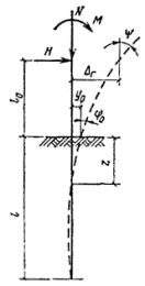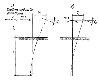 Рис. 3. Схемы перемещений свай со свободным верхним концом от действия Перемещения d1, d2 и d3 вычисляются по формулам: где dНН, dМН и dММ-перемещения сечения сваи в уровне поверхности грунта от единичных усилий, приложенных в том же уровне; определяются согласно указаниям п. 5 приложения к главе СНиП II-17-77. Для фундамента с низким ростверком lo=0, и, следовательно, d1=dНН; d3=dМН; d2=dММ (16) Если сваи оперты на нескальный грунт и имеют