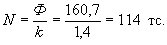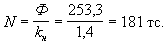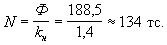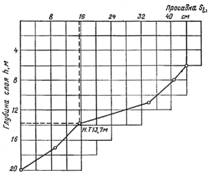 Принятая глубина забивки сваи выбрана правильно, так как при ней полученная расчетная нагрузка 114 тс превышает проектную незначительно. Поскольку сваи будут забивать до размыва дна русла (при низком горизонте воды), расчетный отказ вычисляется исходя из значения расчетной нагрузки на сваю No, определенной с учетом величины нагрузки Ф¢, воспринимаемой силами трения на боковой поверхности сваи в пределах пласта песчаного грунта, смываемого в период прохода паводка: