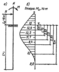 где lо-длина участка сваи, м, расположенного выше поверхности грунта (в качестве lо допускается принимать расстояние по вертикали от подошвы ростверка до поверхности грунта); при низком ростверке lо=0; l-фактическая глубина погружения сваи (см. п. 3 приложения к главе СНиП II-17-77), м; Ф-несущая способность сваи при работе на сжимающую нагрузку, тс, определяемая согласно указаниям п. 5.5 той же главы СНиП; Сп-коэффициент постели грунта под подошвой набивной сваи, сваи-оболочки или сваи-столба, тс/м3; Fп-площадь подошвы набивной сваи, сваи-оболочки или сваи-столба, м2, определяемая по диаметру их ствола, а при наличии уширенной пяты-по наибольшему диаметру уширения. а-силы Н=1; б-момента М=1 Коэффициент постели Сп, тс/м3, принимается равным