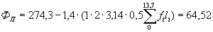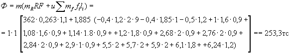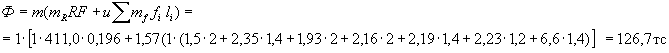 тf=0,6 [табл. 7(5)]. По табл. 2(2) определяем значение fi: f1=1,5 тс/м2; f2=2,35 тс/м2; f3=2,7 тс/м2; f4=2,43 тс/м2; f5=2,51 тс/м2. Несущую способность определяем по формуле [14(10)]: Ф=m(mRRF + uSmffili)=1 [134 × 0,785 + + 1,57 × 0,6 (1,5 × 2 + 2,38 × 1,4 + 2,74 × 1,2 + 2,44 × 1,6 + + 2,55 × 1,6 + 2,63 × 1,6 + 6,43 × 0,4)]= = 1 (105 +0,942 × 24,4)=128 тс. Расчетная нагрузка на сваю