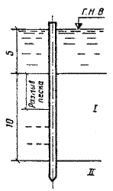 Рис. 6. Схема грунтовых условий забивки свай I-песок мелкий; II-глина полутвердая IL=0,2 Требуется определить глубину забивки свай и величину расчетной нагрузки на сваю для вычисления расчетного отказа. Решение. Для предварительного расчета несущей способности принимаем заглубление низа сваи на 2 м в глину с консистенцией IL=0,2 (см. рис. 3). Пользуясь формулой [7(7)], определяем несущую способность сваи: