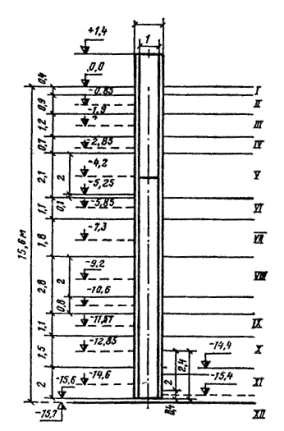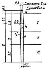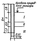 Рис. 11. Схема геологического разреза I-песок пылеватый; II-супесь IL=0,6; III-суглинок IL=0,5. Для середины каждого участка определяем периметры сечения сваи: