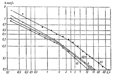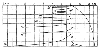 Рис. 3. Расчетные сопротивления глинистых грунтов на боковой поверхности свай и свай-оболочек f с консистенцией 0,2 ³ IL ³0 Следует также указать на особенности, которые необходимо учитывать при назначении сопротивления грунта на боковой поверхности ствола сваи с уширенным нижним концом (булавовидных свай). Такие сваи, как отмечено в пояснениях к п. 2.3 настоящей главы, рекомендуется применять только в оплывающих грунтах. Однако даже в таких грунтах в процессе погружения этих свай, грунт, окружающий их ствол, оказывается в разрыхленном состоянии. Поэтому сопротивление грунта на боковой поверхности ствола булавовидных свай обычно рекомендуется назначать не более f=1 тс/м2. При определении расчетных глубин забивки свай для назначения расчетных сопротивлений грунта по табл. 1(1) и 2(2) для свай и свай-оболочек фундаментов опор мостов глубина местного размыва принимается эквивалентной срезке грунта. Если сваи или сваи-оболочки забивают до удаления грунта из котлована или в русле реки сквозь слой грунта, который будет смыт в период прохода паводка, то принимаемую для вычисления расчетного отказа расчетную нагрузку, допускаемую на сваю Р, можно считать равной получаемой по расчету с добавлением части нагрузки, воспринимаемой грунтом за счет сил трения на боковой поверхности свай в пределах толщины слоя удаляемого (при разработке котлована или при размыве дна) грунта.