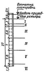 Рис. 7. Схема геологического разреза I-суглинок тугопластичный IL=0,5; II-торф; III-суглинок мягкопластичный IL=0,6; IV-глина тугопластичная IL=0,5; V-суглинок тугопластичный IL=0,3; VI-песок мелкий