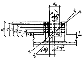 Рис. 4. Схема расчета продольной арматуры стенок стакана Минимальная площадь продольной арматуры в стенках стакана должна составлять не менее 0,05% расчетного сечения бетона стакана. При этом должны удовлетворяться требования по анкеровке продольной арматуры стенок стакана в плитной части ростверка. Поперечная арматура в стенках стакана в сечениях II-II и II¢-II¢ (см. рис. 4) должна определяться по расчетному моменту от действия сил относительно оси, проходящей через точку К или K1 поворота колонны. Величины моментов, тс×м, при этом допускается принимать равными: при