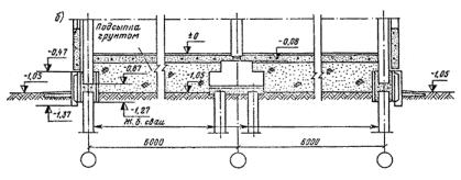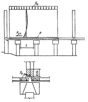 Рис. 1. Типы фундаментов из козловых свай а-ленточные, б, в-отдельно стоящие прямоугольные 4. Короткие козловые сваи, образуемые из свай или забивных блоков с односторонним заострением, могут быть использованы при возведении арочных сооружений, в которых возникают горизонтальные нагрузки (рис. 2).