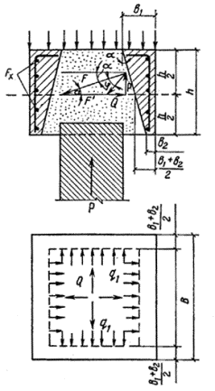 Рис. 1. Схема расчета ростверка на продавливание колонной При стаканном сопряжении сборной колонны с ростверком и эксцентриситете e >0,5dк, (dк-высота сечения колонны) величину SPфi допускается определять, принимая величину момента не более M=0,5dкN, при этом высота ростверка определяется из расчета на продавливание по периметру колонны. При полном моменте M=eN и соответствующей ему сумме реакций SPфi высота ростверка должна, кроме того, проверяться на продавливание по наружному периметру стакана; г) рабочая высота составных ростверков принимается как для цельных ростверков той же высоты. 5. При сборных железобетонных двухветвевых колоннах, имеющих общий стакан, расчет ростверка на продавливание выполняется как при колонне сплошного прямоугольного сечения, соответствующего внешним габаритам двухветвевой колонны. Расчет нижней плиты ростверка на продавливание угловой сваей по п. 3 настоящего приложения должен производиться при следующих условиях (рис. 2): а) считается, что две рабочие боковые поверхности пирамиды продавливания проходят от плоскости внутренних граней сваи до ближайших граней ступени при ступенчатом ростверке; б) рабочая высота ростверка hi при определении габаритов пирамиды продавливания принимается равной высоте нижней ступени ростверка; в) расчетная продавливающая сила Nnp принимается равной расчетной нагрузке на угловую сваю, включая влияние местной нагрузки (например, от стенового заполнения) с учетом моментов в двух направлениях. 6. Расчет прочности наклонных сечений ростверка на действие поперечной силы и на изгиб должен производиться в соответствии с требованиями главы СНиП по проектированию бетонных и железобетонных конструкций применительно к случаю изгибаемых элементов без поперечной арматуры с учетом дополнительных требований, изложенных в пп. 7 и 8. При расчете на поперечную силу предельные значения расчетных величин должны приниматься как для сплошных плит.