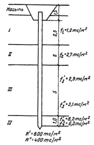 Рис. 9. Схема геологического разреза I-супесь IL=0,7; II-песок пылеватый средней плотности; III-суглинок IL=0,4; IV-песок средней крупности, плотный Несущая способность одиночной сваи определяется по формуле [7(7)]: 1) для плотных песков