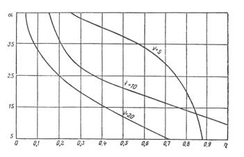 где l-длина сваи, м; a-угол заострения сваи, град; h-коэффициент угла скольжения, который зависит от отношения v=l/b (где b-размер стороны сечения сваи в плоскости поворота сваи) и определяется по графику (рис. 3);