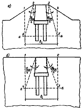 Для восприятия данного момента достаточно арматуры 4Æ10А-III. ПРИЛОЖЕНИЕ 13РАСЧЕТ И ПРОЕКТИРОВАНИЕ ФУНДАМЕНТОВ ИЗ КОРОТКИХ КОЗЛОВЫХ СВАЙ1. Особенностью козловых свай является их наклон к вертикали, в результате чего увеличивается площадь опирания на грунт и изменяются условия работы сваи в грунте. Это несколько повышает несущую способность свай на вертикальные вдавливающие и весьма существенно повышает сопротивление свай горизонтальным нагрузкам. 2. Несущая способность фундамента с козловыми сваями складывается из сопротивления грунта под острием, сил трения по их боковым поверхностям и дополнительных сил сопротивления от отпора грунта по нижней наклонной боковой поверхности сваи на участке, расположенном в ее верхней части. 3. Короткие козловые сваи можно применять для устройства фундаментов под стены и колонны. При ленточных ростверках могут быть применены парные или одиночные сваи. Для устройства фундаментов под колонны могут быть использованы парные козловые сваи и сваи, погружаемые с наклоном от центра фундамента в различных направлениях (рис. 1).