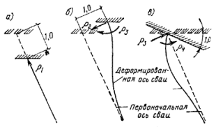 Рис. 2. Схемы перемещения ростверка, соответствующие а-силе r1; б-силе r2 и моменту r3; в-силе r3 и моменту r4 В формулах (4) знаки S означают суммирование по всем рядам свай (по всем п сваям на плоской расчетной схеме фундамента). В частном случае, когда рассчитывается фундамент с одними вертикальными сваями, формулы (4) упрощаются и принимают вид: