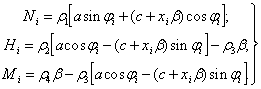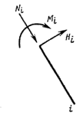 Рис. 4. Положительные направления усилий, передаваемых от ростверка на сваю 10. Расчет сваи на совместное действие продольной Ni и поперечной Hi нагрузок и момента Мi (см. рис. 4) следует производить как для вертикальной сваи согласно указаниям приложения к главе СНиП II-17-77. 11. Если расчет фундамента производится с учетом сопротивления грунта перемещениям низкого ростверка (см. п. 6 настоящего приложения), то следует проверить выполнение условия