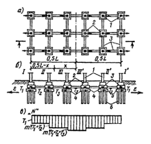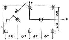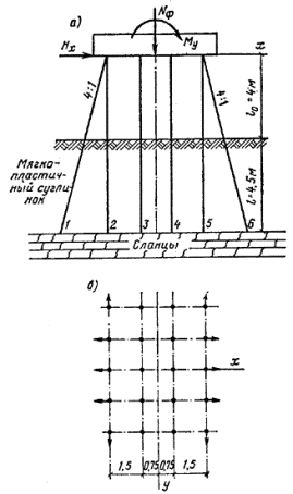 Рис. 5. К примеру расчета свайного фундамента а-его плоская расчетная схема: б-план расположения свай в уровне подошвы ростверка Решение. В соответствии с п. 3 приложения к главе СНиП II-17-77 условная ширина сваи bc=l,5d + 0,5=1,5 × 0,35 + 0,5=1,03 м. Согласно п. 2 того же приложения, для мягкопластичного суглинка принимаем коэффициент пропорциональности