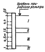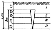 Рис. 12. Схема геологического разреза 1-суглинок мягкопластичный e=0,65, IL=0,6, v=1,65 гс/м3; j=22°; II-песок пылеватый e=0,75, j=26°; v=19 тс/м3; III-суглинок тугопластичный IL=0,4, j=22°, e=0,55, v=17 тс/м3; IV-песок средней крупности e=0,55, j=38°, v=21 тс/м2