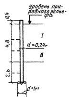 Рис. 13. Схема геологического разреза I-суглинок тугопластичный il=0,4; II-суглинок тугопластичный il=0,5, j=22°; III-глина полутвердая il=0,3 Решение. Расчетное сопротивление R грунта под нижним концом сваи-оболочки определяем по формуле [15(11)].