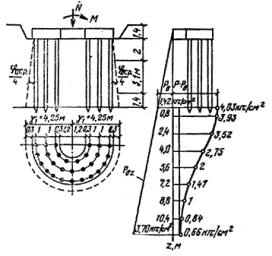 вычислении значения h2 по формуле [26(15)] этого приложения следует принимать hп-глубина заложения в грунте подошвы ростверка; jI и gI-расчетные характеристики грунта, окружающего ростверк (угол внутреннего трения и объемный вес), определяемые с учетом указаний п. 6 приложения к главе СНиП II-17-77. Примечание. Если давление sп не удовлетворяет условию (20), но при этом несущая способность свай по материалу недоиспользована и перемещения верха опоры меньше предельно допускаемых величин, рекомендуется в число внешних нагрузок включить силу