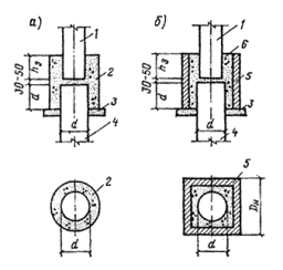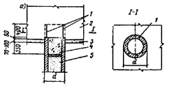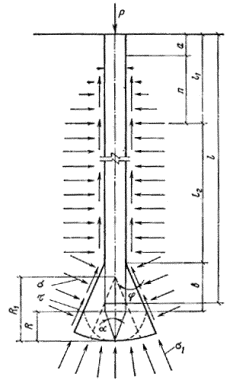 где Р-расчетная нагрузка на сваю, тс; a-угол наклона внутренней полости оголовка к вертикали, град; j-угод трения бетона по бетону, град. (tgj=0,65); б) для круглого оголовка по формуле