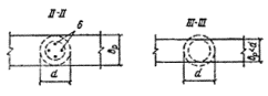 Рис. 3. Схема расчета наклонных сечений ростверка на действие поперечной силы При многорядном расположении свай проверка прочности наклонных сечений ростверка должна производиться по сечениям, проходящим через внутренние грани каждого ряда свай. Расчетный изгибающий момент для каждого сечения определяется как сумма моментов от реакции свай (от расчетных нагрузок на ростверк) и от местных расчетных нагрузок, приложенных к консольному свесу ростверка по одну сторону от рассматриваемого сечения по формулам: Мai=SРф.п x-Мo,а, (1) Мвi=SРф.п yi-Мo,в. (2) где Мai и Мвi-изгибающие моменты в рассматриваемых сечениях, тс×м; Рф.п-расчетная нагрузка на сваю, нормальная к площади подошвы ростверка, тс, хi и yi-расстояния соответственно от осей свай до рассматриваемого сечения, м; Мo,а и Мo,в-изгибающие моменты в рассматриваемых сечениях от местной нагрузки, тс×м. Примечание. При работе свай на выдергивание необходимо производить проверку прочности ростверка на изгиб на действие отрицательных реакций свай. 9. В ростверках стаканного типа, когда отношение толщины стакана к высоте его уступа или к глубине стакана равно или более 0,75, стенки стакана допускается не армировать. При отношении толщины стенок стакана к высоте его уступа или к глубине стакана менее 0,75 стенки стакана ростверка должны рассчитываться как железобетонные элементы в соответствии с требованиями главы СНиП по проектированию бетонных и железобетонных конструкций с учетом дополнительных требований п. 10 настоящего приложения. 10. Расчет продольной арматуры стенок стакана производится на внецентренное сжатие как коробчатого сечения в плоскости заделанного торца колонны (рис. 4, сечение I-I).