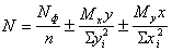 По формулам (18) находим значения продольной и поперечной нагрузок и момента, действующих в месте сопряжения с ростверком на каждую из свай. Все вычисления сводим в таблицу, в которой принято: r3b=0,3901×103×1,34×10-4=0,052 тс; r4b=1,779×103×1,34×10-4=0,238 тс×м; Результаты расчета контролируем, проверяя выполнение условий равновесий ростверка: Nф=Ski(Ni cosji-Hi sinji); Hx=Ski(Ni sinji + Hi cosji); My=Ski [(Ni cosji-Hi sinji)xi + Mi]. Убеждаемся, что эти равенства удовлетворяются: Ski(Ni cosji-Hi sinji)=3 (18,6×0,97 + 0,232×0,242) + + 2×39,3 + 5×46,7 + 5×54 + 2×61,3 + 3 (79,1×0,97-0,036×0,242)=980 тс=Nф; Ski(Ni sinji + Hi cosji)=3(-18,6×0,242 + + 0,232×0,97) + 2×(2 + 5)×0,213 + 3(79,1×0,242 + 0,036×0,97)=48 тс=Hx; Ski [(Ni cosji-Hi sinji)xi + Mi]= = 3 [(18,6×0,97 + 0,232×0,242) (-2,25)-0,706] + 2 [39,3 (-2,25)-0,63] + 5 [46,7 (-0,75)-0,63] + + 5(54×0,75-0,63) + 2 (61,3×2,25-0,63) + 3 [(79,1×0,97-0,036×0,242) 2,25-0,105]=510 тс×м=My. |