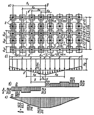 где К, hп и а-те же величины, что и в формулах (1), (2) и (7) настоящего приложения. Пример. Требуется определить продольную N и поперечную Н нагрузки и момент М, действующие в месте сопряжения с ростверком на каждую сваю, при следующих расчетных значениях внешних нагрузок на фундамент, приведенных к точке, расположенной в уровне подошвы ростверка на вертикальной оси симметрии фундамента: Nф=990 тс; Нх=48 тс и Му=510 тс×м. Плоская расчетная схема фундамента и грунтовые условия показаны на рис. 5, а; план расположения свай в уровне подошвы ростверка приведен на рис. 5, б. Сваи железобетонные сечением 35´35 см; жесткости их поперечного сечения при сжатии и изгибе соответственно равны: EбF=3,09×103 тс; EбI=3,15×103 тс×м2.