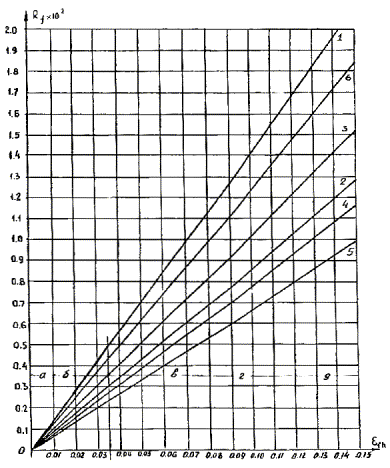 2.4. Относительная деформаций морозного пучения efh , как правило, должна устанавливаться на основе опытных данных. При отсутствии опытных данных допускается определять efh по физическим характеристикам грунтов. 2.5. При проведении инженерно-геологических изысканий на площадке планируемого строительства отбор проб грунта для лабораторных испытаний должен производиться через каждые 25 см по глубине выработок в слое сезонного промерзания dfh. Выработки закладываются в наиболее характерных точках площадки (на повышенных и пониженных участках) в пределах контура проектируемого здания. Примечание. Для всех разновидностей пучинистых грунтов нормативная глубина сезонного промерзания в Московской области может быть принята равной 1,5 м. - гранулометрический состав грунта, классифицирующий его вид; - плотность грунта в сухом состоянии, rd - плотность твердых частиц грунта, r s - пластичность грунта: влажность на границах раскатывания - глубину сезонного промерзания грунта d fh 2.7. Относительная деформация морозного пучения грунта определяется по графикам (рис. 2.1) с использованием параметра Rf вычисляемого по формуле Здесь