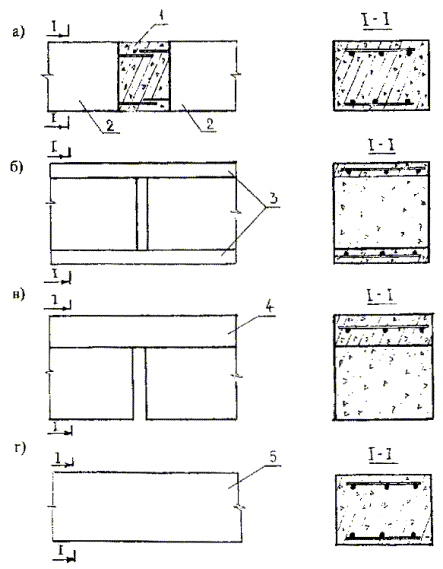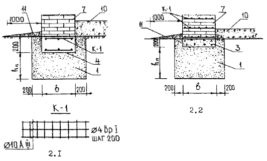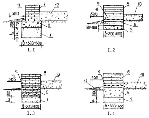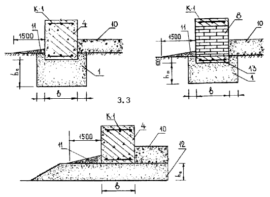 2.11. Пески пылеватые и мелкие при степени влажности 0,6 < Sr £ 0,8, крупнообломочные грунты с заполнителем (глинистым песком пылеватым и мелким) от 10 до 30% по массе относятся к слабопучинистым грунтам, для которых принимается efh = 0,035. Пески пылеватые и мелкие (при 0,8 <Sr£ 0,95), крупнообломочные грунты с тем же заполнителем более 30% по массе относятся к среднепучинистым грунтам (efh = 0,07). Пески пылеватые и мелкие при Sr > 0,95 относятся к сильнопучинистым грунтам (efh = 0,10). 2.12. Степень пучинистости грунтов следует учитывать при выборе типа фундамента и способа подготовки основания в соответствии с Приложением 2. 3. Конструирование и расчет мелкозаглубленных фундаментов3.1. Требования к конструкциям мелкозаглубленных фундаментов3.1.1. При строительстве на практически непучинистых грунтах мелкозаглубленные фундаменты устраиваются на выравнивающей подсыпке из песка, на пучинистых грунтах - на подушке из непучинистого материала (песок гравелистый, крупный или средней крупности, мелкий щебень, котельный шлак и др.), которая может быть как врезной, так и устраиваемой на поверхности грунта. 3.1.2. Мелкозаглубленные ленточные фундаменты следует устраивать: - на практически непучинистых и слабопучинистых грунтах - из бетонных (керамзитобетонных) блоков, уложенных свободно, без соединения между собой, из монолитного бетона, бутобетона, цементогрунта, бута или глиняного кирпича; - на среднепучинистых грунтах (при efh £ 0,05) - из бетонных (керамзитобетонных) блоков, уложенных свободно, без соединения между собой или из монолитного бетона; - на среднепучинистых (при efh > 0,05) и сильнопучинистых грунтах (при efh<0,12) - из сборных железобетонных блоков, жестко соединенных между собой, или из монолитного железобетона; - на чрезмерно пучинистых грунтах (при efh ³ 0,12) - из монолитного железобетона. Примеры конструктивных решений мелкозаглубленных ленточных фундаментов приведены в Приложении 3. 3.1.3. При efh >0,05 ленточные фундаменты всех стен здания должны быть жестко соединены между собой и объединены в единую конструкцию - систему перекрестных лент. 3.1.4. При недостаточной жесткости стен зданий, строящихся на сильнопучинистых и чрезмерно пучинистых грунтах, следует производить их усиление путем устройства армированных или железобетонных поясов в уровне перекрытий. 3.1.5. Мелкозаглубленные столбчатые фундаменты на среднепучинистых (efh >0,05), сильнопучинистых и чрезмерно пучинистых грунтах должны быть жестко соединены между собой фундаментными балками, объединенными в единую систему. 3.1.6. При устройстве столбчатых фундаментов необходимо предусматривать зазор между нижними гранями фундаментных балок и планировочной поверхностью грунта не менее расчетной деформации (подъема) ненагруженного основания. 3.1.7. Секции зданий, имеющие разную высоту, следует устраивать на раздельных фундаментах. 3.1.8. Примыкающие к зданиям веранды на сильнопучинистых и чрезмерно пучинистых грунтах следует возводить на фундаментах, не связанных с фундаментами зданий. 3.1.9. Протяженные здания, строящиеся на грунтах с efh ³ 0,05, необходимо разрезать по всей высоте на отдельные отсеки, длина которых принимается: для среднепучинистых грунтов - до 30м, сильнопучинистых (при efh ³ 0, 12) - до 24 м, чрезмерно пучинистых (при efh > 0,12) - до 18м, 3.1.10. Мелкозаглубленные фундаменты на сильнопучинистых и чрезмерно пучинистых грунт
