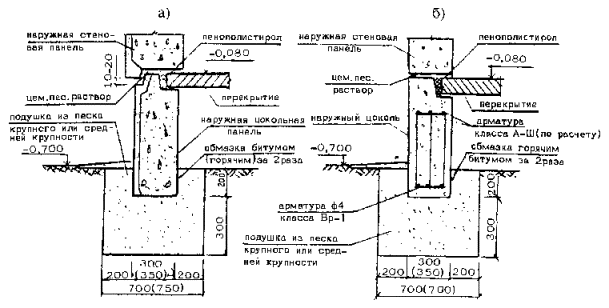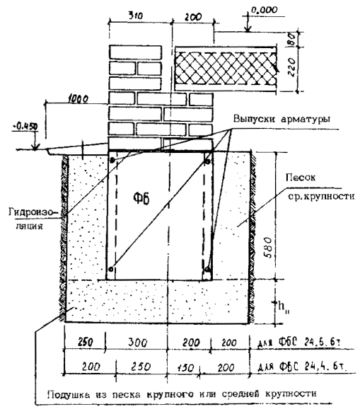Расчет деформаций пучения основания выполняется в соответствии с Приложением 6. 5. Указания по устройству мелкозаглубленных фундаментов на естественном основании5.1. Работы по подготовке строительных площадок должны выполняться в соответствии с требованиями СНиП 3.02.01-87 «Земляные сооружения, основания и фундаменты». Для снижения возможных деформаций от сил морозного пучения грунтов необходимо выполнять инженерно-мелиоративные мероприятия. 5.2. Для устранения замачивания грунта основания на площадках следует устраивать надежный водоотвод атмосферных вод путем своевременного выполнения вертикальной планировки застраиваемой территории. Работы по вертикальной планировке необходимо производить так, чтобы не изменять направление естественных водостоков. Площадкам следует придавать наибольший уклон (не менее 3%) для стока атмосферных вод, а насыпные грунты послойно уплотнять механизмами до плотности не менее 1,6 т/м 3 и пористости не более 40% (для глинистого грунта без дренирующих прослоек). Следует сохранять на застраиваемой территории растительный покров, являющийся естественным утеплителем грунта; поверхность насыпного грунта покрывать почвенным слоем на 10-15 см и выполнять его задернение. Площадки должны быть надежно ограждены от стока поверхностных вод с соседних участков или прилегающих склонов местности путем устройства берм и водоотводных канав, уклон которых должен быть не менее 5%. При высокой фильтрационной способности грунтов, залегающих с нагорной стороны, следует предусматривать дренаж вокруг здания с отводом воды в пониженную сторону. 5.3. К разработке траншей и котлованов при устройстве мелкозаглубленных фундаментов следует приступать только после того, как на строительную площадку будут завезены фундаментные блоки и все необходимые материалы и оборудование, чтобы процесс возведения фундаментов выполнялся непрерывно, начиная от устройства котлованов и траншей и кончая обратной засыпкой пазух, уплотнением фунта и устройством отмостки. Цель такого требования - комплексно выполнять все работы, не допуская увлажнения грунтов основания. 5.4. Все работы по подготовке площадок, а также по устройству фундаментов на пучинистых грунтах, как правило, следует выполнять в летнее время. В зимнее время устройство фундаментов (особенно на пучинистых грунтах) требует повышенной культуры производства, технологичности и непрерывности всего процесса работ и приводит к удорожанию их стоимости. 5.5. При необходимости ведения работ в зимнее время грунт в местах устройства траншей и котлованов следует заранее утеплять для защиты от промерзания или произвести искусственное оттаивание. 5.6. Подготовка основания под мелкозаглубленный фундамент состоит из отрывки траншей (котлованов), устройства противопучинистой подушки (на пучинистых грунтах) или выравнивающей подсыпки (на непучинистых грунтах). При устройстве подушки непучинистый материал отсыпается слоями толщиной не более 20 см и уплотняется катками, площадочными вибраторами или другими механизмами до плотности rd ³ 1,6 т/м 3 Зачистку дна траншей допускается не производить, так как песчаные подушки выполняют роль выравнивающей подсыпки. 5.7. Траншеи для ленточных фундаментов следует отрывать узкими (0,8-1,5 м) с тем, чтобы пазухи с наружной стороны здания можно было пер
