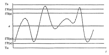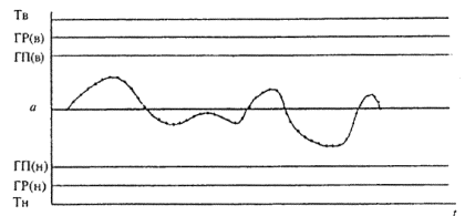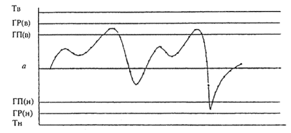 E.2.3 Расчет предупреждающих границ и границ регулирования Предупреждающие границы и границы регулирования рассчитывают отдельно по каждому показателю, контролируемому при приемке цемента. Предупреждающие границы ГП(в, н.) и границы регулирования ГР(в, н.) вычисляют по формулам: где а - норматив контролируемого показателя, установленный технологическим регламентом; S - среднее квадратическое отклонение, вычисленное по формулам (Е.2) или (Е.3); п - число результатов испытаний, используемых для расчета текущего среднего по формуле (E.1). Примечание - Если рассчитанные предупреждающие границы по какому-либо показателю качества не удовлетворяют требованиям нормативного документа, необходимо принять меры для повышения стабильности производства по этому показателю или соответствующим образом изменить норматив в технологическом регламенте. Е.2.4 Обработка результатов По рассчитанным значениям предупреждающих границ и границ регулирования, нормативам (требованиям) по стандарту (Тв,н) и технологическому регламенту (а) строят контрольные карты отдельно по каждому показателю, контролируемому при приемке цемента в потоке. На контрольную карту наносят значения текущих средних. По расположению текущих средних относительно предупреждающих границ и границ регулирования (рисунки E.1-Е.3) согласно E.1.5 принимают решение о приемке цемента в потоке. Пример приемки цемента в потоке по содержанию оксида серы (VI) SO3 Согласно технологическому регламенту содержание SO3 в цементе определяют два раза в смену (через 4 ч). Результаты определения содержания SO3 приведены в таблице Е.2.