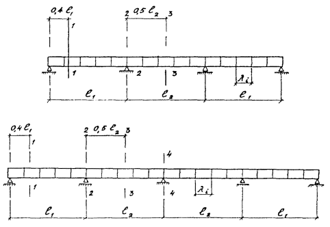 4.2. Указанные в стандартах, действующих на момент проектирования, значения минимального предела текучести st для углеродистой стали относятся к прокату толщиной до 20 мм, для проката толщиной 21 - 40 мм и 41 - 60 мм его уменьшают соответственно в 1,05 и 1,09 раза. Аналогично, для низколегированной стали: минимальный предел текучести st = 350 МПа (3500 кгс/см2) относится к прокату толщиной до 32 мм, для проката толщиной 33 - 60 мм значения st уменьшаются в 1,02 раза; аналогично, минимальный предел текучести st = 400 МПа (4000 кгс/см2) относится к прокату толщиной от 8 до 40 мм. 4.3. Для пролетных строений, запроектированных по СНиП II-Д.7-62, расчетные сопротивления принимаются по письму ЦНИИС Минтрансстроя СССР № 531124 от 12.07.1982 г. 4.4. Производные расчетные сопротивления сталей в элементах конструкций и их соединений определяются по основному расчетному сопротивлению умножением на коэффициент перехода, принимаемые по СНиП II-Д.7-62. Коэффициенты снижения расчетных сопротивлений при расчетах на выносливость, коэффициенты условий работы, продольного изгиба, потери устойчивости плоской формы изгиба, а также коэффициенты, учитывающие пластические деформации стали, принимаются по СНиП II-Д.7-62. 4.5. Допустимые усилия 5. ОПРЕДЕЛЕНИЕ РАСЧЕТНЫХ УСИЛИЙ В НЕСУЩИХ ЭЛЕМЕНТАХ ПРОЛЕТНОГО СТРОЕНИЯ ОТ НОРМАТИВНЫХ ВРЕМЕННЫХ ПОДВИЖНЫХ НАГРУЗОК И ТЯЖЕЛОВЕСНЫХ ТРАНСПОРТНЫХ СРЕДСТВ5.1. Расчетные усилия в расчетных сечениях от временных вертикальных подвижных нагрузок (включая тяжеловесные транспортные средства) вычисляются расчетным путем и по результатам натурных испытаний. 5.1.1. При относительном отклонении рассчитанного усилия от среднего, полученного по результатам натурных испытаний (вычисленного без учета погрешности измерения), более чем на 15 %, в расчет принимается усилие, полученное по результатам натурных испытаний с учетом погрешности измерения (см. пп. 5.3, 5.4), а при разнице между этими усилиями менее 15 % - большее из двух сравниваемых величин по абсолютной величине. 5.1.2. Если в конструкции имеются дефекты, искажающие расчетную схему, в которой их учесть не представляется возможным, то усилия определяются по результатам натурных испытаний с учетом погрешностей измерений (пп. 5.3, 5.4). 5.1.3. Если испытания в соответствии с п. 1.7 проводить нецелесообразно, то усилия определяются только расчетным путем с учетом дефектов, искажающих расчетную схему. 5.1.4. Временные подвижные вертикальные нагрузки необходимо устанавливать в пролетном строении в наиболее невыгодном положении как в продольном, так и в поперечном направлении. 5.1.5. При проверке возможности пропуска тяжеловесных транспортных средств по пролетному строению поперечную невыгодную установку нагрузки допускается принимать в зоне наиболее благоприятных условий ее пропуска (например, по оси проезжей части со смещением от оси в пределах 1,0 м в обе стороны и т. п.). В этом случае проезд нагрузки должен осуществляться в соответствии с указанными ограничениями. 5.2. Усилия в несущих элементах пролетного строения определяются с учетом пространственной работы конструкции, а также с учетом переменности сечений главных балок по длине пролета. 5.4. Усилия в главных балках неразрезных пролетных строений определяются с учетом результатов натурных испытаний по «Инструкции по определению грузоподъемности железобетонных балочных пролетны