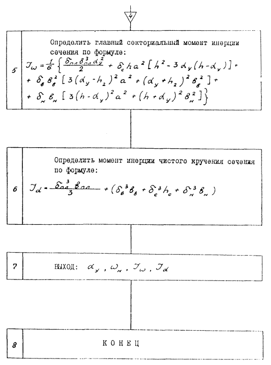 5. БЛОК-СХЕМА субалгоритма «СЕКТОР» определения положения центра изгиба сечения по вертикали - aу, секториальной координаты сечения по центральному нижнему волокну - wн, главного секториального момента инерции Jw , момента инерции чистого кручения Jd для тонкостенного стержня п-образного профиля. Обозначения даны на рис.3.