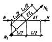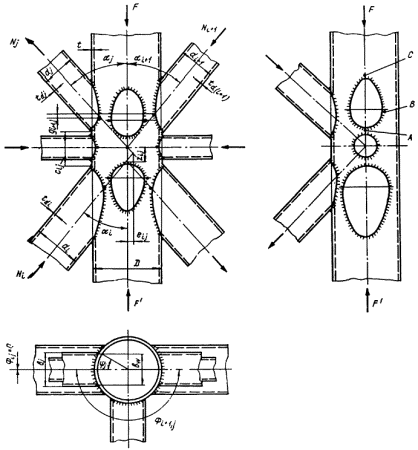 5.18 (5.10). Для определения дополнительных усилий в раскосах перекрестной решетки с целью учета влияния обжатия поясов в сквозных стержнях рассматривается один раз статически неопределимая система, схема которой приведена на рис. 6, а. Разрез одного из раскосов дает основную систему, схемы нагружения которой показаны на рис. 6, б, в.