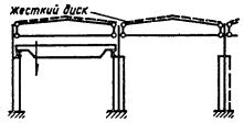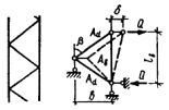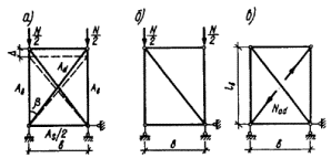Рис. 6. К расчету перекрестной решетки а - расчетная схема; б - основная система; в - дополнительное усилие в раскосе Из решения рассматриваемой задачи получено дополнительное усилие, возникающее в раскосах
