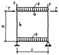 Рис. 1. Расчетная схема рамы Исходные данные. Рама выполнена из стали марки 18пс с расчетным сопротивлением Ry = 240 МПа. Стойка из широкополочного двутавра № 20 Б3 имеет следующие геометрические характеристики: h = 202 мм; b = 100,4 мм; d = 5,6 мм; t = 9,6 мм; Н = 4 м; А = 3,06×10-3 м2, Ix = 2,15 × 10-6 м4; Wx = 2,13×10-4 м3; rx = 8,39×10-2 м. Ригель из широкополочного двутавра № 20 Б* имеет следующие геометрические характеристики: h = 194 мм; b = 99,3 мм; d = 4,5 мм; t = 5,5 мм; L = 4 м; Ix = 1,3×10-5 м4; Wx = 1,34×100-4 м3; Sx = 7,58×10-5 м3. Нагрузки: q = l8,355P, кН/м; T = 3,234Р, кН; V = 204,93Р, кН. а) Расчет по СНиП П-23-81* Отношение жесткостей на 1 м длины ригеля и стойки n равно: