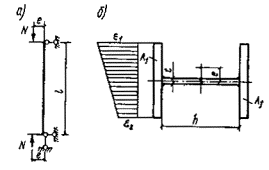 При наиболее вероятном ослаблении сечения отверстиями для болтов от 8 до 25 % (a = 0,92-0,75) и Ru/Ry > 1,39 gс = 1,09-1,18. При Ru/Ry < 1,39 gс = 0,99-1,18; при этом меньшее значение gс соответствует Ru/Ry = 1,17, что выполняется для двух марок сталей 12Г2СМФ и 12ГН2МФАЮ, приведенных в СНиП II-23-81*. С учетом изложенного в СНиП II-23-81* приняты gс = 1,1 для сталей с пределом текучести sу £ 440 МПа (4500 кгс/см2); gс = 1,0 - для сталей с пределом текучести sу > 440 МПа (4500 кгс/см2). С целью упрощения расчетов на прочность сечений, ослабленных отверстиями для болтов, указанные значения коэффициентов gс приняты и для других видов напряженно-деформированных состояний элементов конструкций (сжатие, изгиб, сжатие или растяжение с изгибом; см. поз. 6-8 табл. 6* СНиП II-23-81*). 5.5. При расчете на прочность центрально-сжатых элементов необходимо учитывать особенности работы стали на сжатие (см. п. 4.8). В частности, расчет на прочность центрально-сжатых элементов с соединениями на болтах класса точности А допускается выполнять как для неослабленных элементов [1]. 5.6 (5.2). Работа растянутых элементов стальных конструкций после достижения металлом предела текучести при Ru/Ry > gи = 1,3 допускается в ограниченных случаях, когда при значительных деформациях конструкций не нарушается их нормальная эксплуатация. К таким конструкциям относятся, как правило, отдельные листовые конструкции, в основном, с равномерным распределением напряжении (например, листовые настилы, некоторые виды трубопроводов и резервуаров и т.п.). Учитывать работу стали после достижения предела текучести в каждом конкретном случае необходимо на основе опыта проектирования и эксплуатации соответствующего типа конструкций. 5.7. Требования по проверке устойчивости центрально-сжатых стержней установлены в СНиП II-23-81* на основе расчета внецентренно-сжатых стержней с учетом влияния формы сечения, начального искривления оси, случайного эксцентриситета сжимающей силы, а также соединительных элементов (для сквозных стержней). Начальные искривления или случайные эксцентриситеты приняты в соответствии с допускаемыми отклонениями, установленными в нормах на изготовление стальных конструкций [8]. При решении поставленной задачи был рассмотрен внецентренно-сжатый стержень, схема которого приведена на рис. 3, а. При этом решение выполнялось в предположении малости перемещений по деформированной схеме с учетом пластических деформаций, а значение расчетной несущей способности принято равным предельному значению сжимающей силы Nu, которая может быть воспринята элементом (рис. 3, б). Форма изогнутой оси принималась по полуволне синусоиды.